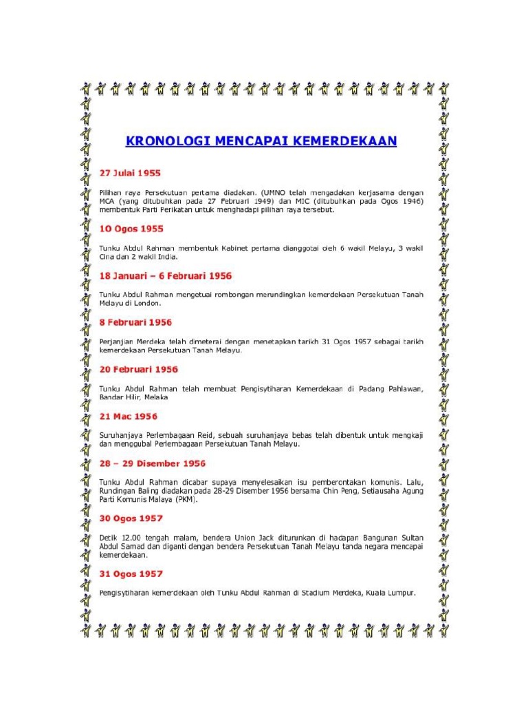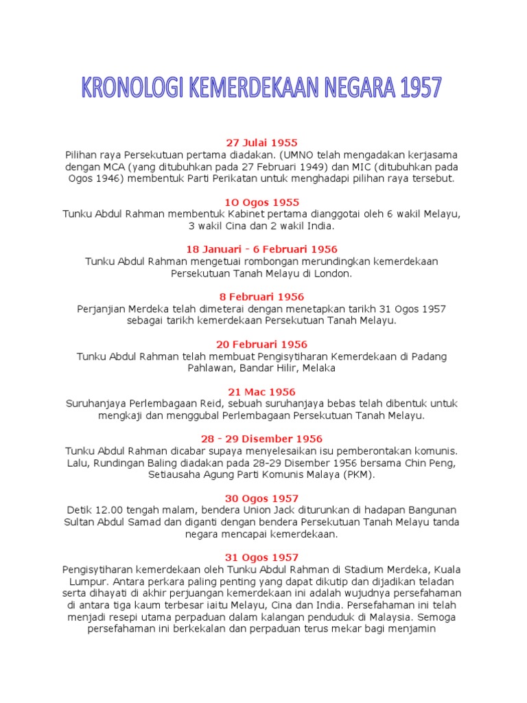 Sebelum tanah melayu mencapai kemerdekaan tanah melayu telah ditadbir oleh british. Sebelum, 31 ogos 1957, tarikh keramat yang menjadi rentetan kronologi tidak wajar dilupakan ialah pada 2 januari 1956. Kesimpulannya, pengetahuan tentang proses kemerdekaan tanah melayu ini penting bagi pelajar supaya mereka dapat menghargai jasa pejuang negara dan mereka tidak buta akan sejarah. Keretapi tanah melayu (ktm) (jawi: Diharapkan agar kita dapat mengambil ikhtibar atas.
